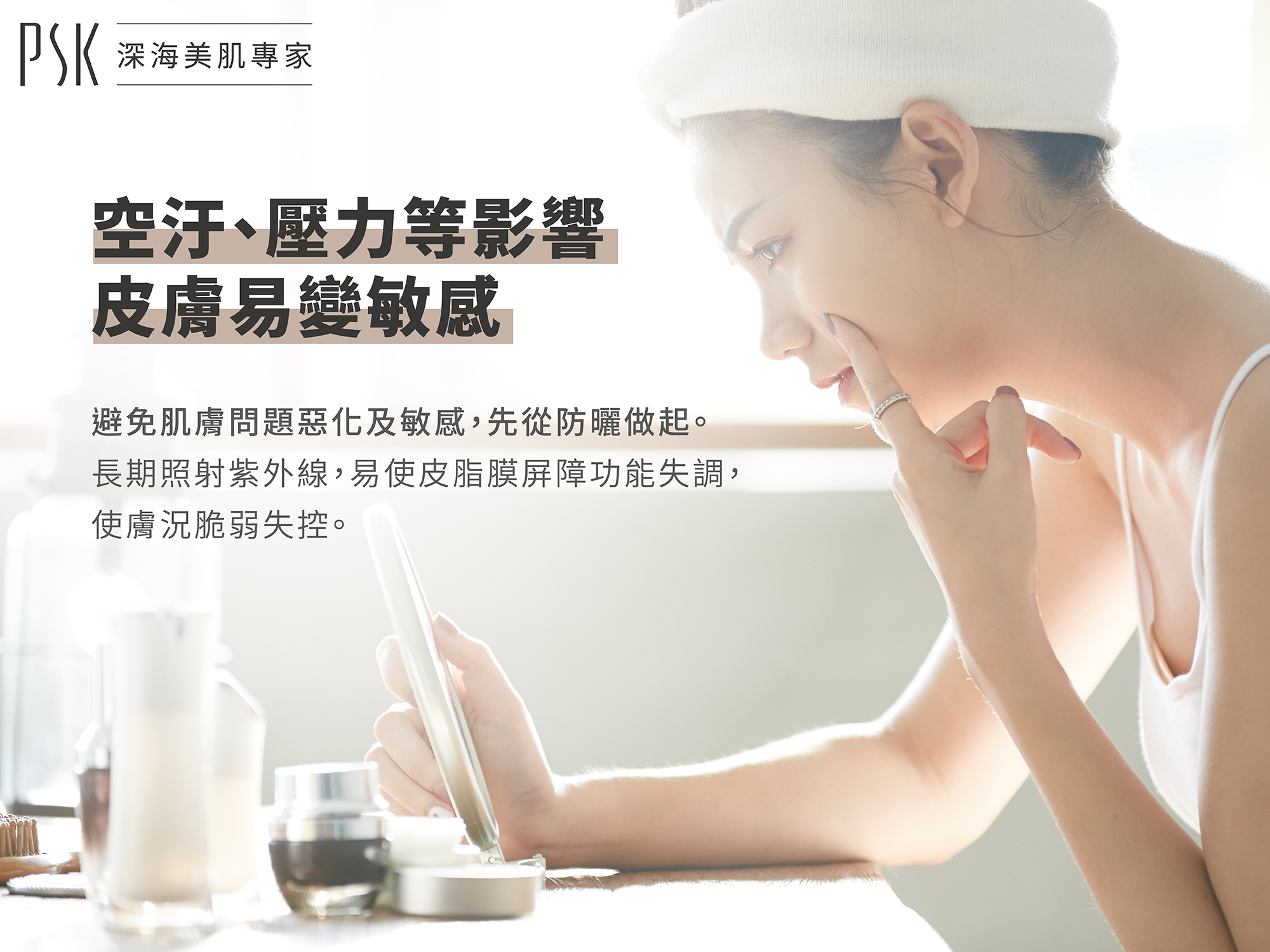 要做好敏感肌的調理,除了維持健康的身心狀態與飲食作息外,也要非常注意防曬!因為長期照射紫外線(不只室外,紫外線也會穿透至室內),不僅會使肌膚曬黑、傷、紅、老,乾燥缺水,還會產生灼熱、刺痛、發癢等不適感受,尤其是皮脂膜屏障功能失調的敏感肌,必須特別加強防曬工夫,抵禦紫外線的侵襲,才有助於穩定膚況。