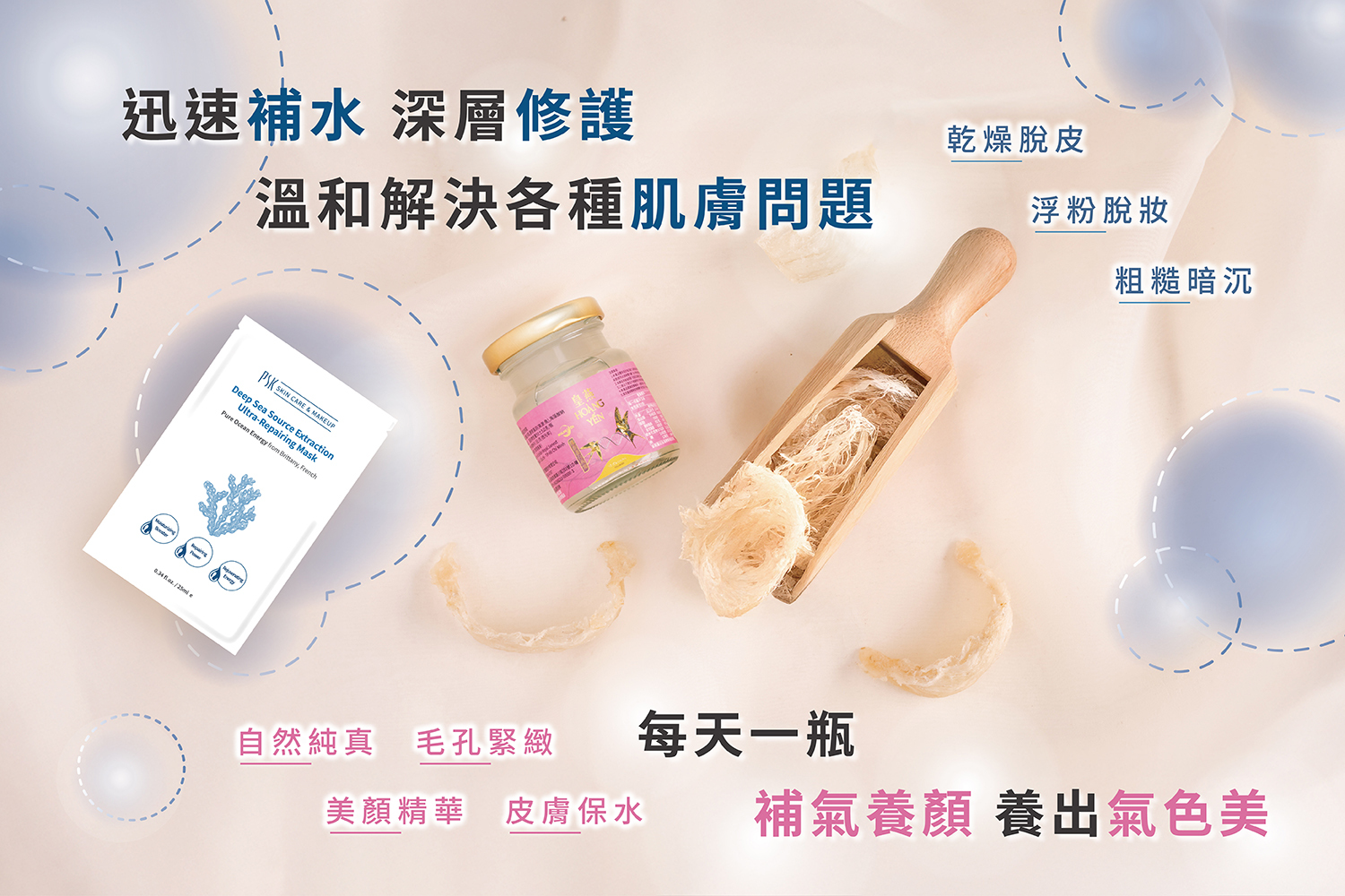 結合「複方膠原蛋白燕窩」以內養潤澤肌膚,搭配 「深海源萃極效修護面膜」提供深層補水與柔嫩修護。