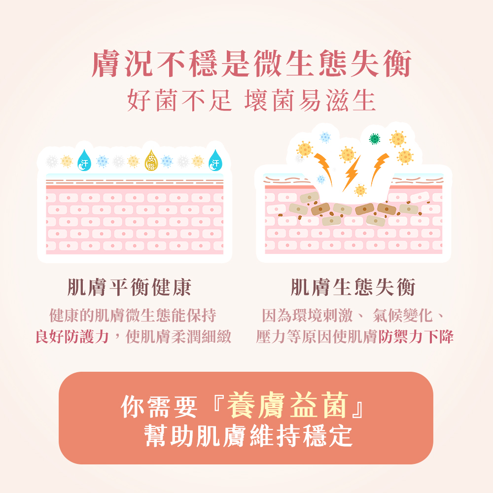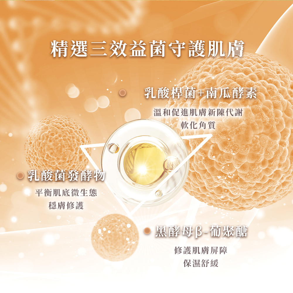 添加三效益菌:乳酸桿菌、乳酸菌發酵物與黑酵母葡聚醣,幫助平衡肌膚微生態、淨膚潤澤