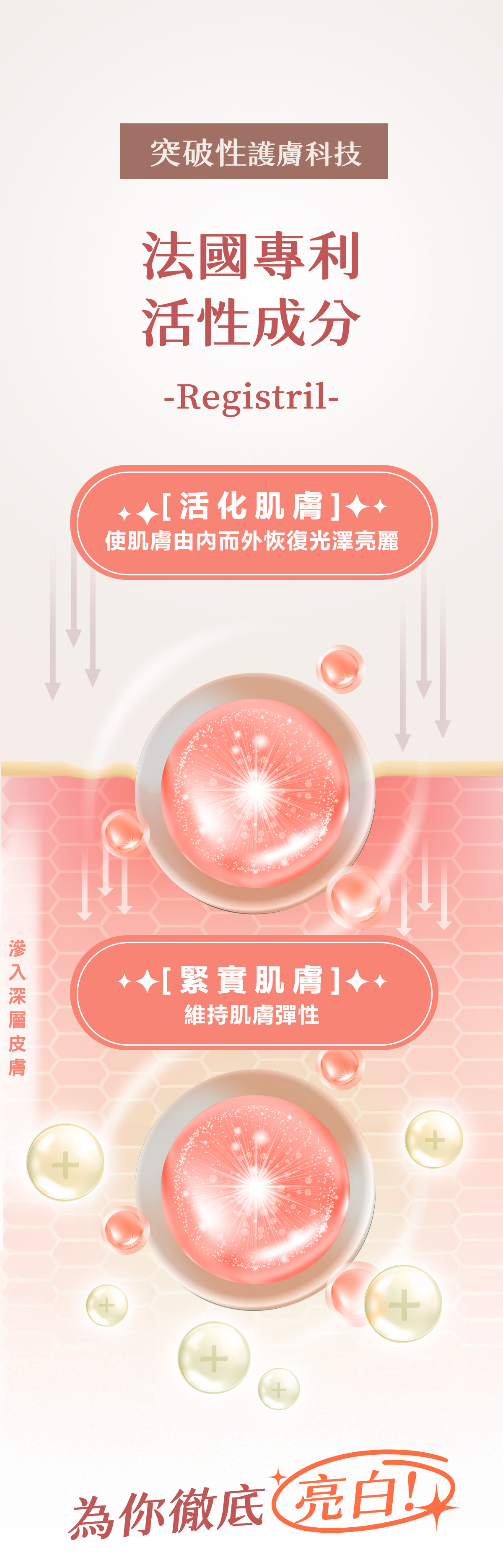 主要成份:法國深海紅藻(OLIGOGELINE®)、維他命C、積雪草萃取、Regestril™專利撫紋成分