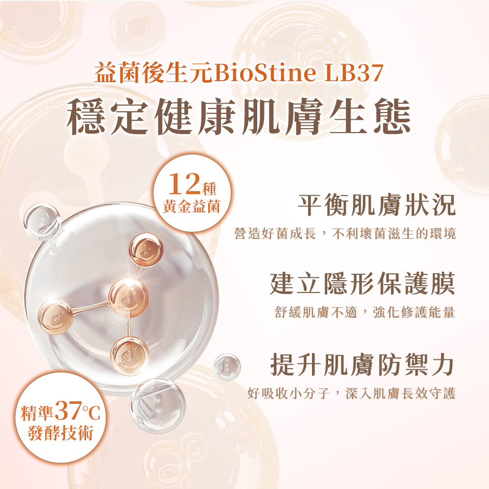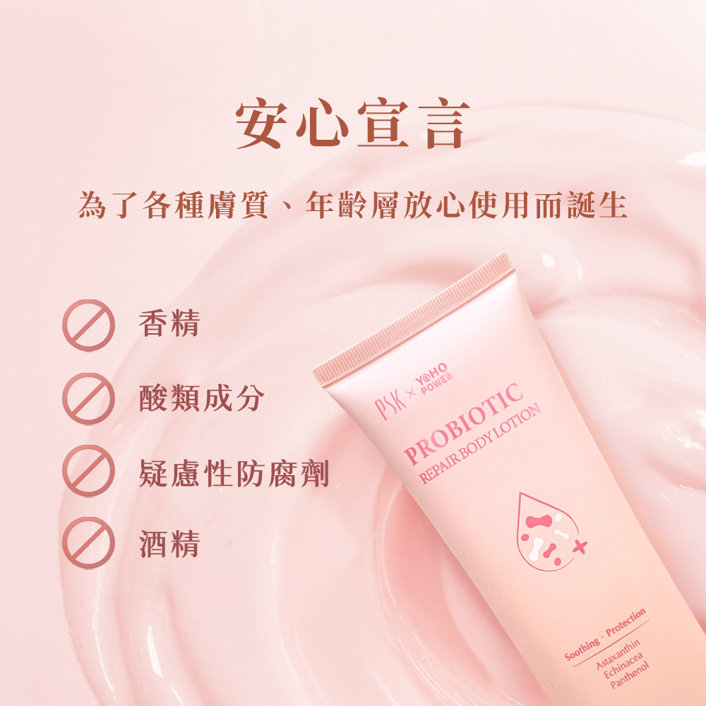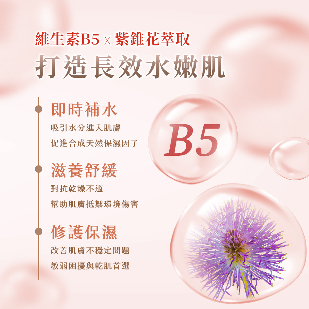以益菌後生元為基礎,搭配維他命B5、紫錐花萃取,深層潤澤乾燥肌膚、修護肌膚屏障,緩解緊繃不適
