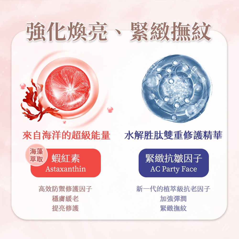 加入蝦紅素與緊緻抗皺因子,不只提亮修護還能彈潤撫紋